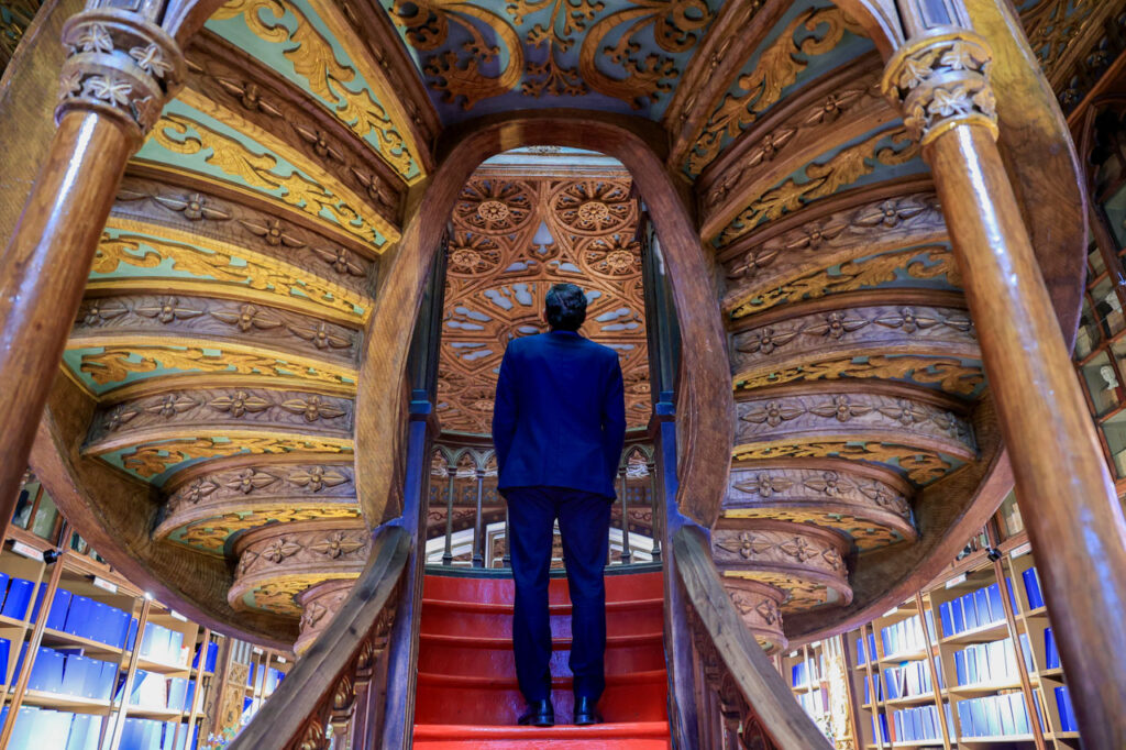 O primeiro-ministro, Luís Montenegro, admira a escadaria da Livraria Lello, durante a cerimónia para assinalar a data dos 120 anos da Livraria Lello no Porto, 13 de janeiro de 2026. ESTELA SILVA/LUSA