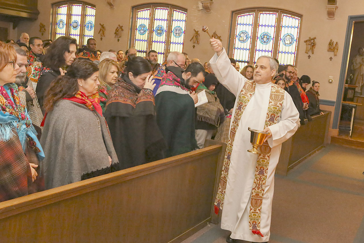O padre missionário Nuno Miguel Rodrigues procedendo à bênção da romaria de Pawtucket, RI, na igreja de Santo António em Domingo de Ramos. PT/A.Pessoa